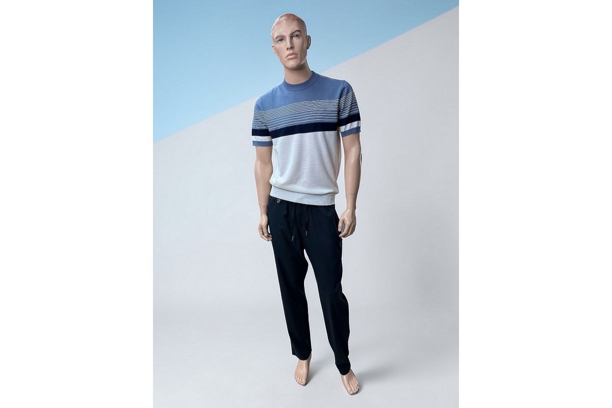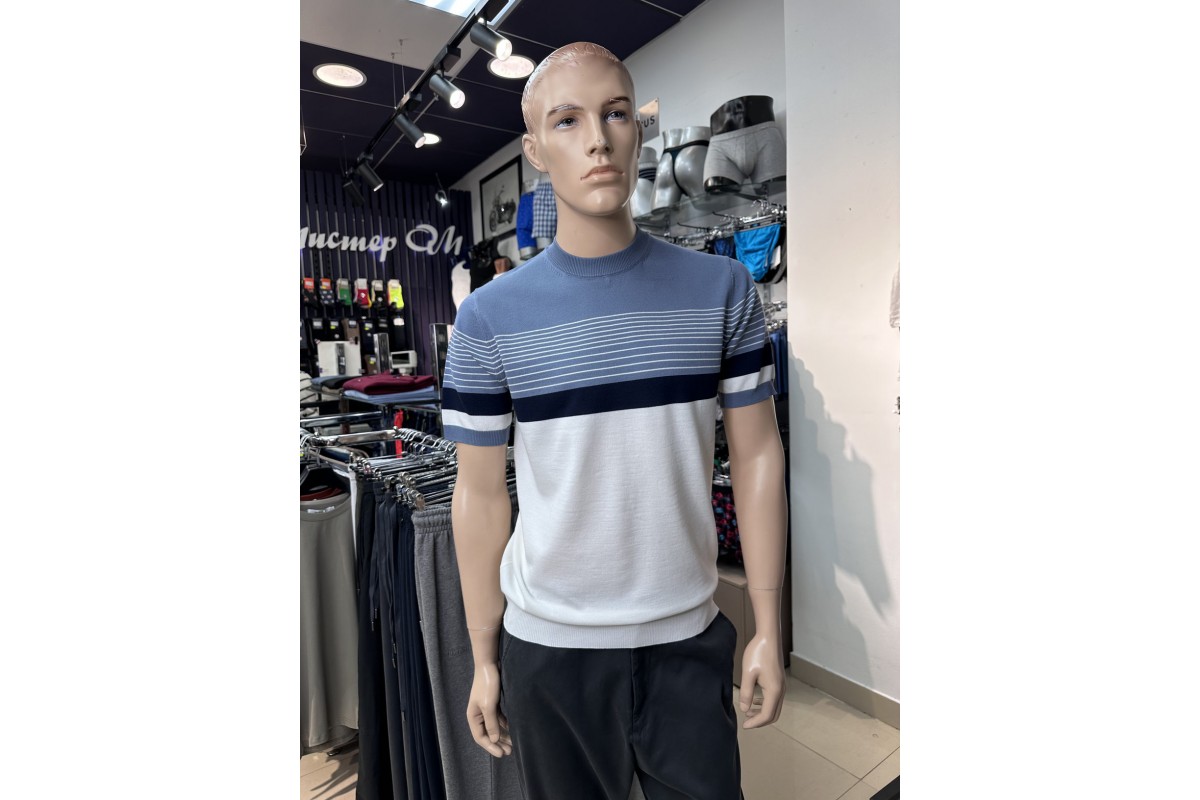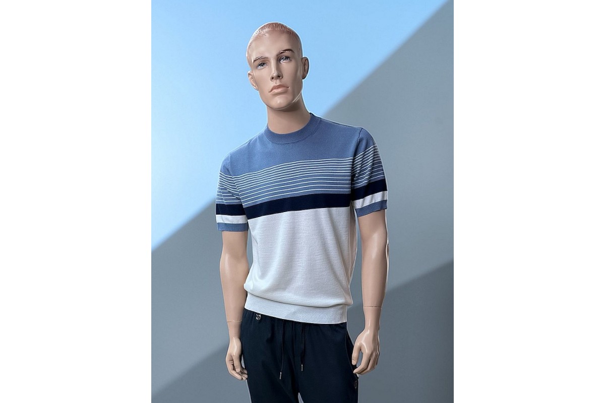 Мужской джемпер с короткими рукавами серо-голубого цвета из тонкого трикотажа на основе хлопка и полиэстера. Модель отличается современным дизайном в стиле колор-блок, где мягкий голубой верх плавно переходит в классический белый через акцентную темно-синюю полосу.