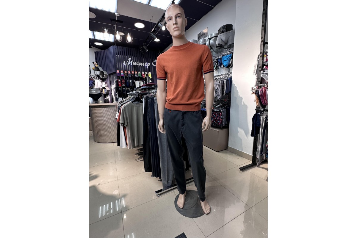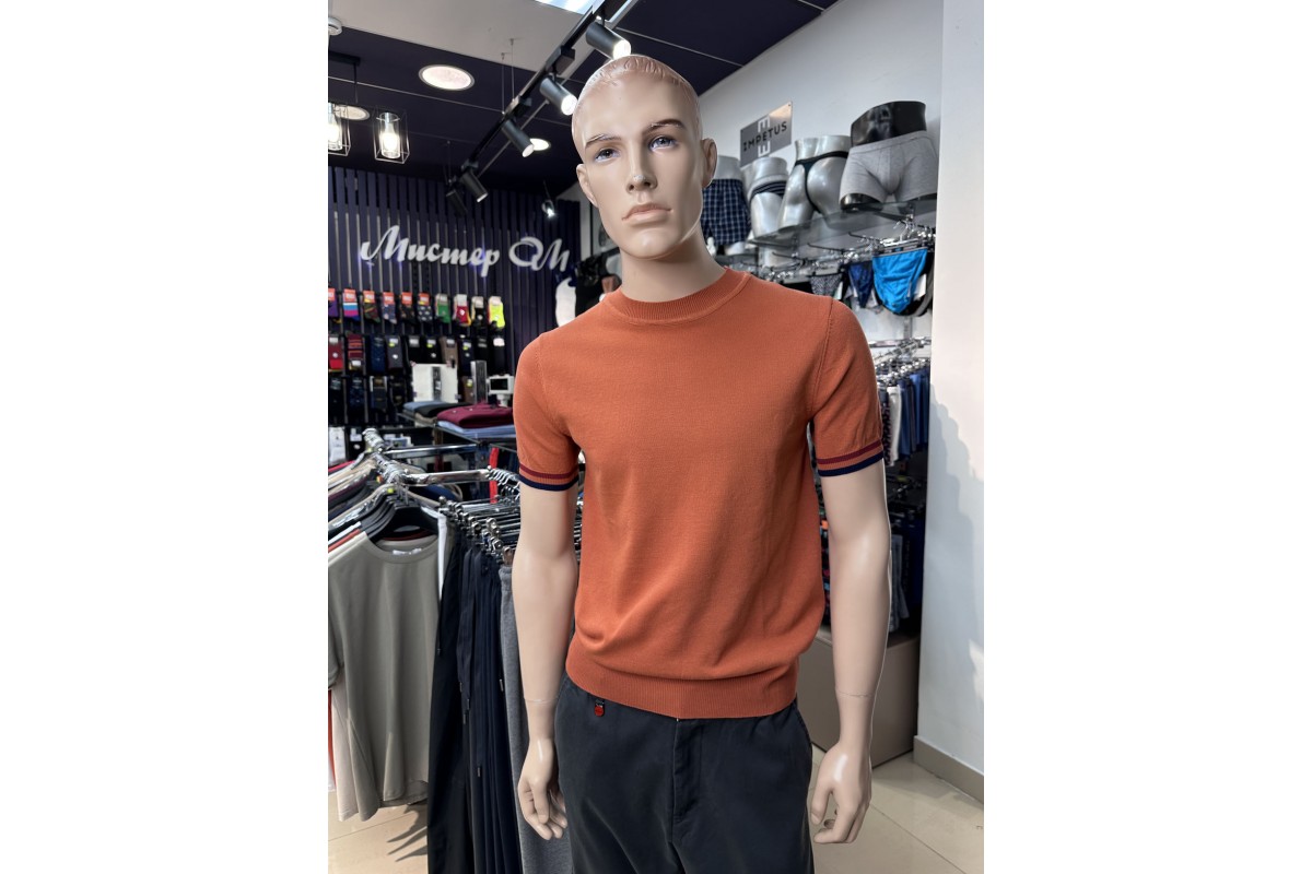 Терракотовый мужской джемпер с короткими рукавами из тонкого трикотажа на основе хлопка и полиэстера.