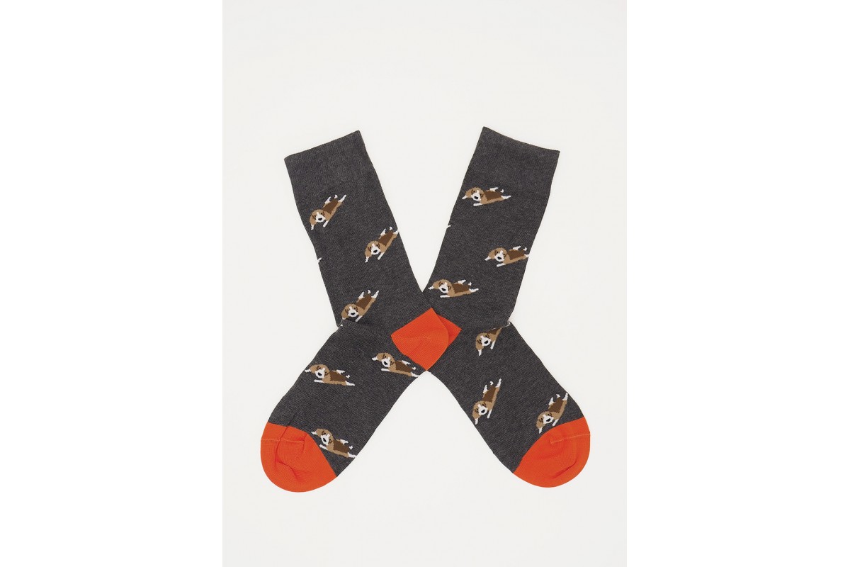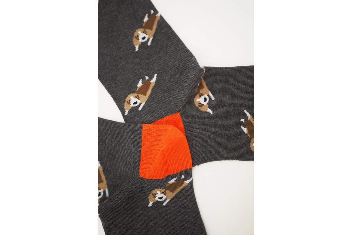 - принт с собачками на фоне цвета серый меланж, пятка и носок оранжевые;