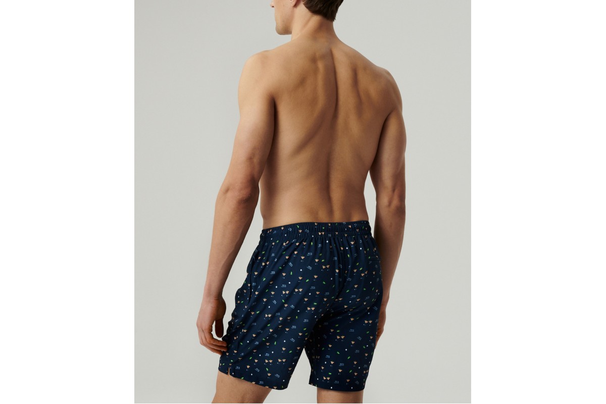 Темно-синие мужские пляжные шорты с принтом 4Way Stretch Hello Summer из летней коллекции. Выполнены из технологичного полиэстера с характеристикой 4-Way Stretch (растяжение в 4 направлениях), который быстро сохнет и сохраняет форму даже после частого контакта с водой и солнцем. В отличие от обычных материалов, которые тянутся только в одном или двух направлениях, эта ткань эластична поперек, вдоль и по диагонали. Новинка!.
