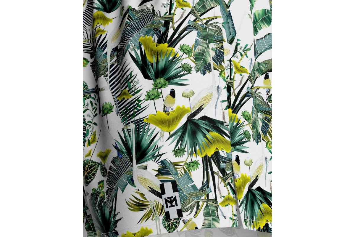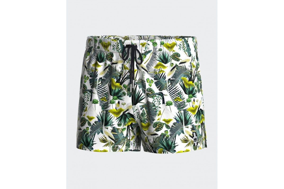 Плавательные шорты мужские Bali из легкого и быстросохнущего полиэстера с флористическими мотивами. Узор из сочных тропических листьев в разнообразных оттенках зелёного переплетается с изящными силуэтами птиц, создавая гармоничную композицию, которая словно переносит в душистые заросли экзотического леса. Модель добавит образу выразительности и подойдет для создания яркого летнего образа.